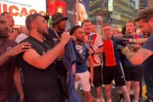 气氛热烈!众多巴黎球迷聚集在时代广场,载歌载舞为球队助威